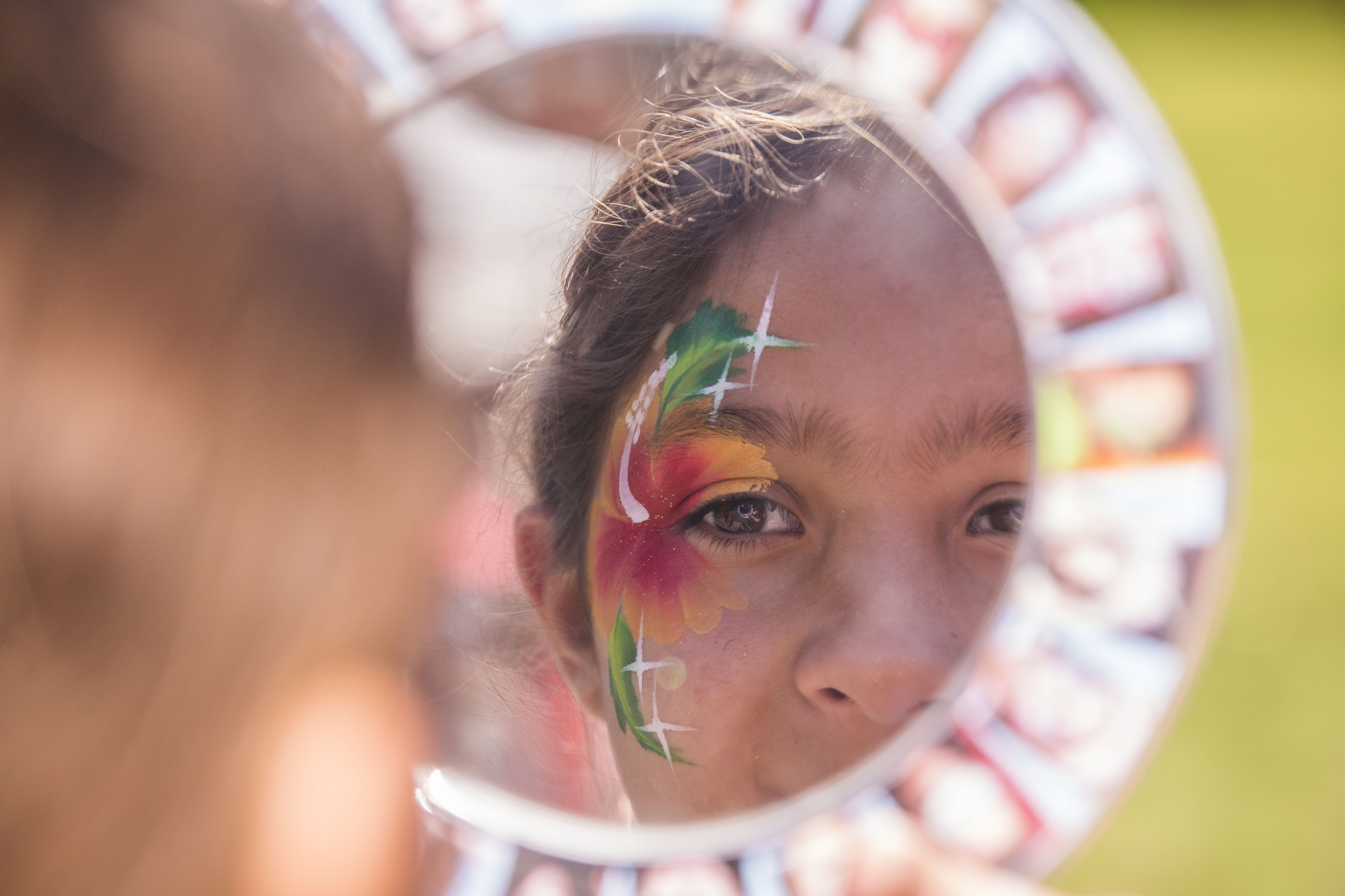 One of my favorite little girls to paint that day chose a design that has a red glittery heart on the forhead with a rainbow coming out from both sides. I always add pretty red-glittery-lips, which little girls love so much that they often come back to have me touch them up! When she looked into the mirror for the first time after I painted her, she was glowing with joy! It’s moments like those that fill me with so much love for what I do! She giggled and couldn’t wait for her parents to see it!